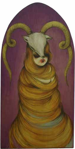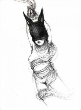 Sur sa tête repose la ruse morte du renard, ornée de cornes et d’oreilles attentives. On dirait qu’elle revient d’un bal costumé, ou bien peut-être d’une cérémonie secrète. Miss Van la prêtresse, Miss Van la pythie. Son image oscille entre la figure d’une ménade revenant des bacchanales et celle d’une princesse pleurant le départ de son prince.