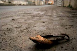 Une chaussure, jamais par paire, comme trace, comme reste de passage, comme bribe d’histoire à créer ou à imaginer.