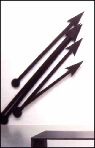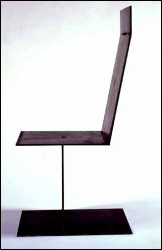Comme les sculptures et certains objets, les meubles sont fabriqués en acier. L’acier brossé, avec soudures et découpes apparentes, permet, contrairement au bois, d’employer des plaques à la fois minces et résistantes, et d’imposer la ligne au détriment des surfaces et des volumes : des étagères en surplomb, des pieds de faible épaisseur, des pieds et des dossiers de chaises sans traverse. Les meubles sont stables bien que les obliques ou les appuis manquants leur confèrent une apparente instabilité. Ils ont l’air de défier les lois de la pesanteur. Instabilité que l’on retrouve dans l’œuvre sculpté : dans Accident, des poutres sont appuyées contre un mur, mais instables, prêtes à tomber.