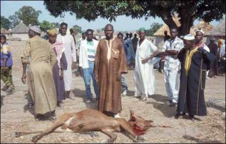 Les clichés de musiciens venus accompagner la cérémonie, ceux d’un groupe de personnes posant autour d’un taureau sacrifié pour le bien du village, traduisent l’intérêt toujours vivace de Malick Sidibé pour le portrait. Il transpose ainsi ses préoccupations de Bamako à son village natal et improvise un studio dans la rue : les visages et les corps des habitants font face à l’appareil photographique, se découpent sur une simple toile tendue et soutenue par deux personnes en partie visibles sur l’image.