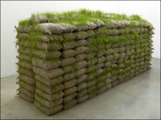 — Jardin suspendu, 2008. Sacs de jute, terre, herbes. 131 x 90 x 315 cm