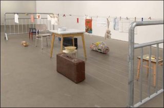 Tendus entre deux barrières de rue métalliques, des câbles à mi-hauteur font office de fils à linge de fortune. Un certain nombre d’objets familiers sont ainsi suspendus : poupées, valises, bureau d’écolier, mappemonde gonflable, jouets, torchons qui n’en finissent pas de sécher.