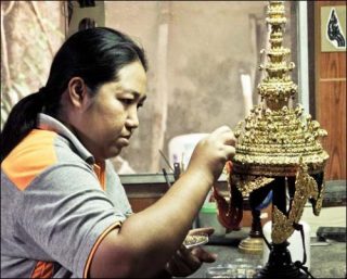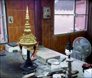 La seconde vidéo fait le portrait de Woralak Sooksawasdi na Ayutthaya, l’arrière-arrière-arrière-petite fille du roi Mongkut. Maître artisan d’art et créatrice de couronnes de théâtre, elle a été nommée par l’actuelle reine de Thaïlande pour enseigner les arts royaux au Centre royal des arts et métiers populaires de Bang Sai, situé au nord de Bangkok. Cependant, aucun élève n’est inscrit à l’heure actuelle dans sa classe. Tandis que Sooksawasdi évoque tour à tour sa propre généalogie et le déclin de l’artisanat d’art royal, la caméra explore son atelier baigné dans une douce lumière tropicale. Entourés des instruments et matériaux de leur métier, Sooksawasdi et son époux consultent les données numériques enregistrées par le jeune homme au château de Fontainebleau. Ne tenant pas compte des possibilités de reproduction infinies que ces données recèlent, ils incarnent un savoir-faire artisanal. Arin Rungjang nous laisse sur ces images qui illustrent un travail long et méticuleux et se contentent de faire allusion à l’objet qui en résultera. C’est dans l’exposition que nous découvrons le chef-d’œuvre achevé de Sooksawasdi, à savoir la réplique de 2015 de la réplique de 1861 de l’original de la couronne royale de Siam de la dynastie Chakri créée en 1782.