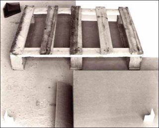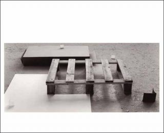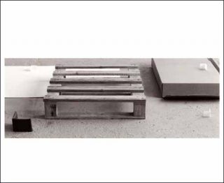A partir d’une installation très minimale posée au sol, une palette de bois, deux-trois bouts de planches d’aggloméré, l’artiste sculpte sa photo à partir de son objectif.