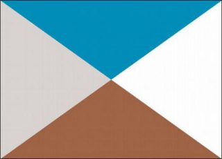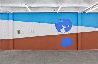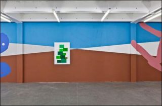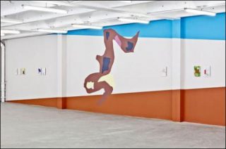 Le wall painting de douze mètres de long sur lequel se superposent toutes les autres pièces de l’exposition constitue de fait un arrière-fond programmatique. Composé de quatre triangles monochromes se rejoignant au centre de l’image, il emprunte ses couleurs — bleu, marron, jaune et blanc — à celles dominant l’espace urbain depuis la fenêtre de l’appartement parisien de l’artiste. Ce «paysage urbain» parfaitement abstrait, figurant déjà sur le carton d’invitation au vernissage, fonctionne en tant qu’outil de communication, tout en dessinant le drapeau d’un pays imaginaire.