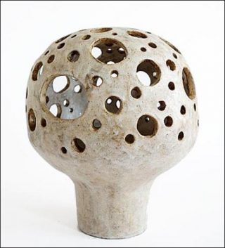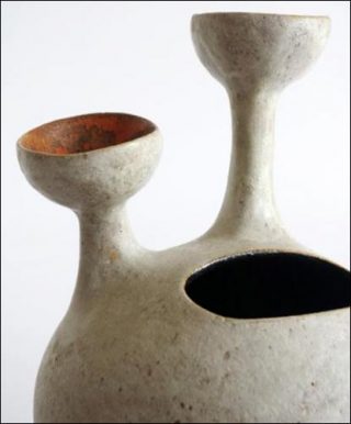 Les pièces présentées à la galerie Jousse Entreprise ont été conçues uniquement par André Borderie dans son atelier à Senlis après la dissolution de la communauté en 1957. Son univers formel nourri par l’observation de la nature gagne en simplification et monumentalité: de larges coupes effilées tendues dans l’espace, des «Têtes à lumière» sphériques, des boîtes et des vases boules ou galets sont exécutées en grès, avec une terre chamottée qui adopte une peau externe rugueuse et minérale avec parfois un réseau de fines craquelures. Cette rigueur intellectuelle se retrouve jusque dans l’émaillage des pièces quasi monochromes, jouant sur de subtiles oppositions de mates et de brillants rompus parfois par des touches de couleurs chaudes: des rouges-orangés, sa couleur préférée ou des émaux bleus-gris qui témoignent de l’apport de la peinture de Miro.