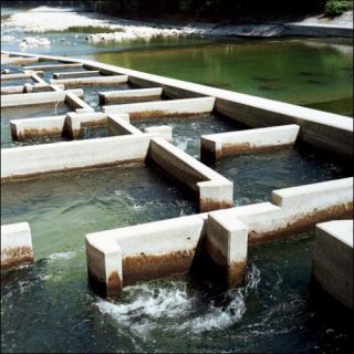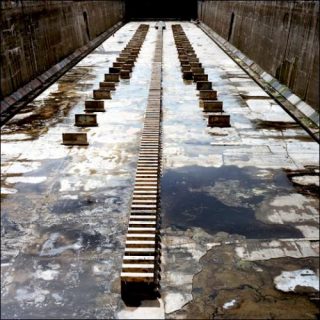 Dans Labyrinthe et Ecluse – Forme Joubert, paysages de béton et d’eau inspirés des écluses de Munich et de Saint-Nazaire, les prises de vues en plongée ou en contre-plongée permettent à Claire Adelfang de neutraliser les perspectives et de jouer des lignes de construction. Elle accentue alors le caractère irréel de ces environnements déshumanisés.