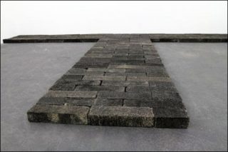 Block, par exemple, est un bitume crunchy que j’ai inventé, un bitume très léger, expansé. J’ai toujours pensé que la route et le mur étaient mariés, et que la route était un mur tombé au sol. J’ai donc construit différents murs: parpaings bruts avec des mortiers colorés, et j’ai également réalisé des routes composées de ce bitume crunchy.
