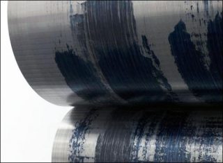 Dans Roll, ces rouleaux, que j’appelle «Maître et Esclave», sont recouverts, d’un côté, de peinture à l’huile et, de l’autre, de peinture à l’eau. Ce qui m’intéresse c’est d’éprouver les qualités premières de la peinture: la couleur, la matière, etc., en opposant huile et acrylique. Bien sûr, ces matières ne se sont pas mariées et n’ont pas formé une troisième couleur.