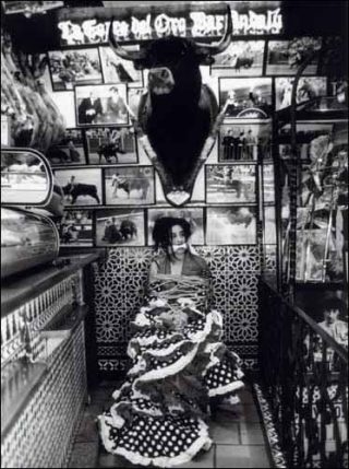 Dans cette photographie, Pilar Albarracin, parée d’une robe et d’une coiffe rouges de danseuse de flamenco, tournée de trois quart, tient entre ses mains la tête d’un taureau, dans une position proche de celle qui précède le moment du baiser. Prise en légère contre-plongée, devant un voile aux tons rouges qui leur fait fond, l’animal et l’artiste semblent communier.