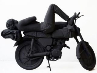 Brigitte Zieger procède à des arrêts sur image sur des événements de l’histoire contemporaine afin de mettre en doute notre culture visuelle, celle des médias, mais plus encore, de faire vaciller notre éducation du regard. Par ses dispositifs, l’artiste attire l’œil, le séduit pour ensuite lui donner à voir, au-delà de l’apparente beauté, les signes de toutes sortes de violence. Ce deuxième niveau de lecture interroge notre capacité à vivre dans la violence sans pour autant la voir. Elle présente ici une sculpture en résine polyester intitulée Le motard endormi.