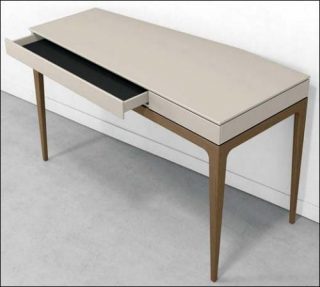 La collection Moved est composée d’une console, d’une coiffeuse, d’un bureau et d’une table de chevet. Toutes les pièces sont montées sur trois pieds et ont été réalisées en laqué mat avec des piètements en chêne massif teinté. La coiffeuse est équipée d’un miroir et d’un espace «boîte à bijoux».