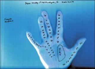 Comme traces, il y a cette phrase coloriée au mur par Douglas Gordon (I am the prophet of my own annihilation) avec, au sol, les pelures des crayons de couleur qui y ont laissé leur peau. Il y a aussi celle de Vittorio Santoro (I wonder how much time I’ve spent for waiting the lights to change) gravée, couleur sang, dans le papier, et, en face de cette scarification, quelques mots écrits sur une main par Jérémie Gaulin (Je me force à oublier, je vais oublier, j’ai oublié). Dans le même registre, nous avons la Main mnémonique de Jacques Roubaud, où se déploie une étrange cartographie dans laquelle les nombres se succèdent sans s’effacer.