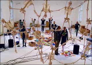 La scène est entièrement occupée par des instruments, qui assignent à chacun des huit interprètes une place limitée, tandis que la partition les cordonne en un ballet mécanique conçu pour des automates. 12/ …im linken Rückspiegel auf dem Parkplatz von Woolworth s’apparente au premier abord à un horrible concert de pop-music : voix criardes, textes creux, pincements de nez pour chanter encore plus mal, guitares, claviers, consoles et destruction d’instruments classiques. Mais petit à petit, des décalages laissent entrevoir le play-back, des effets de désynchronisme accusent l’artifice, tandis qu’un rideau composé de squelettes fait écran avec la scène …