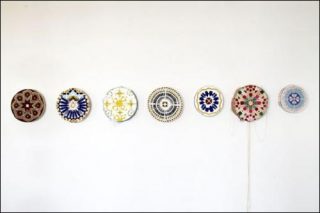 Parallèlement aux enregistrements qu’ils purent effectuer, et à partir desquels ils montent actuellement une pièce radiophonique, Scoli Acosta poursuivit sa production artistique dans la résidence de Dar Al- Ma’mûn, en périphérie de Marrakech, où il avait été invité pour réaliser ce projet. En écoutant attentivement les enregistrements originaux de Paul Bowles, il y remarqua la prédominance d’un instrument traditionnel marocain, un tambourin cylindrique appelé «bendir». Gardant en tête ses peintures Pentagonal Monochrome (tambourine) et leur relation au son, Scoli Acosta réalisa une série de peintures et de sculptures totémiques à partir de cadres circulaires de bendirs et de matériaux fournis par un artisan local qui l’assistait dans son travail. Pris ensemble, totems et monochromes distillent les éléments constitutifs de la peinture — toile, châssis, peinture — tout en insistant sur leur rapport au quotidien et leur ancrage dans le monde.