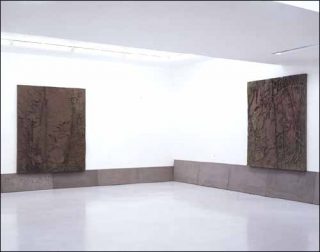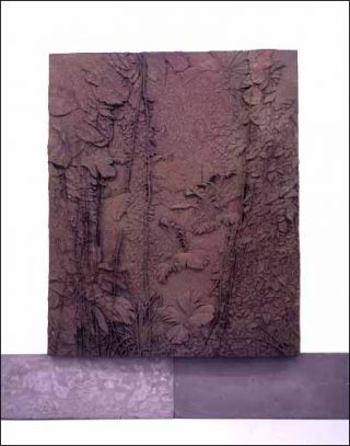 Pour l’occasion, la pièce présentée occupe tous les murs de la galerie. Une dalle synthétique couleur argile carré représente un bas-relief au motif floral. Les plaintes blanches sont remplacés par ce revêtement. On éprouve l’étrange impression d’être au British Museum ou dans la crypte archéologique du Louvre. Cette composition de fleurs fait penser à une empreinte de boue. Les fleurs semblent être momifiées, prises par une glaise. L’aspect est curieux car la matière ressemble à cette mousse que l’on utilise dans le modélisme. Le tout est très beau, très reposant.Â