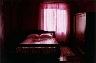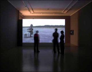 — Hidden, 2005. Vidéo-projection, DV cam sur DVD avec son, écran en bois, ordinateur et programme. 60 mn. Vue de l’exposition à l’Institut d’Art Contemporain, Villeurbanne, France.