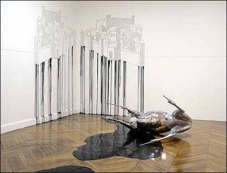 Un cerf de taxidermiste habillé de plaques d’aluminium poli est disposé sur une flaque de peinture noire séchée, qui provient de trous au mur formant un motif paysager. Cette même flaque mène à un château, composé de milliers de cartes à jouer disposées sur des armatures en bois de façon à dessiner des perspectives urbaines. De chaque côté de ce château sont disposées cinq maquettes de navires de guerre, faites en perles de verre. Tous ces éléments forment une allégorie à lire, un ensemble de représentations à interpréter, et un espace à penser.