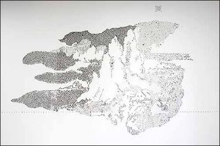 Ces trous forment un décor pointilliste, issu des représentations de villes fortifiées des peintures de Fra Angelico. En face, les navires référencés selon leur origine (Le Cuirassé Voltaire, La Frégate Lafayette…) perdent leur puissance militaire au profit d’une préciosité fragile. Plus que de châteaux et de batailles navales, chaque objet révèle son origine, pour mieux faire éclater l’éphémère trame fictionnelle d’où il est extrait.