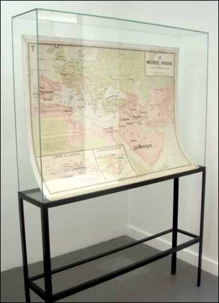 — Sans titre, 2008. Carte de géographie sur carton et vitrine en verre et aluminium. Carte : 100 x 130 cm.
