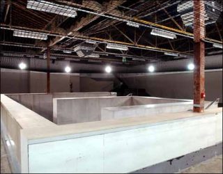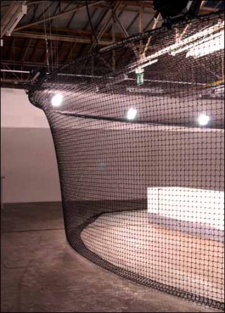 Un chapiteau de filets tendus délimite un espace circulaire autour de la cage d’escalier. L’étage est réduit à un périmètre éclairé par des spots, à une nasse.