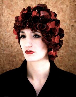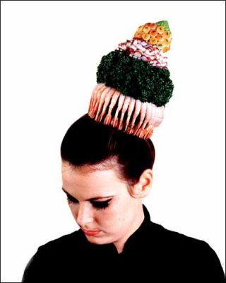 Natacha Lesueur expose des portraits de femmes aux coiffures extravagantes dont les chignons imposants garnis de noix, de concombres ou encore d’ananas, rappellent les perruques des galantes de l’époque de Louis XVI sur lesquelles s’élévaient de véritables plats cuisinés (cochon de lait caramélisé aux truffes).