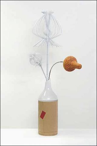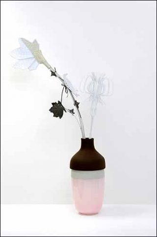 La première est une série de vases (21 modèles différents), qui sont des combinatoires aléatoires toutes différentes, sorte d’écriture mathématique de signes, génétique étrange de formes et de matériaux divers. Vase en verre, pots de terre, papier de boucher, papiers collés, papiers collants, du blanc, un point de rouge … l’inspiration d’une créatrice à l’humour décapant, qui propose des fleurs en verre soufflé, des tiges de plastique qui s’épanouissent en corolle, des feuilles en tissu et des toupies de bois bourgeonnantes qui garnissent des vases envahissants et fuyants sur le sol de la galerie.