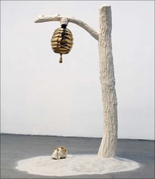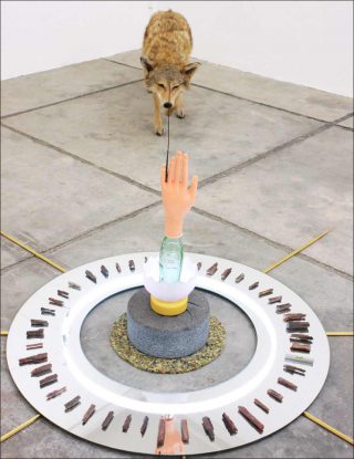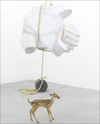 Des animaux empaillés, des ballons de baskets, des branches d’arbre et une colonne ionique fragmentée : voici un aperçu de ce qui compose les œuvres de Gabriel Rico dans son exposition « Nature Loves to Hide ». Quel est le lien entre ces éléments apparemment insolites ? C’est précisément la question soulevée par l’artiste, tout particulièrement à travers une vaste installation murale intitulée II Mural. Elle fait songer aux tableaux blancs recouverts de calculs mathématiques savants, à ceci près que les « x » et « y » des équations sont remplacés par une multitude de minéraux, de végétaux ou d’artefacts.