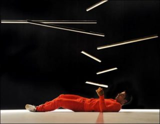 Une pellicule d’eau, un mobile de Xavier Veilhan: les partenaires scénographiques de Fabrice Lambert irisent ses subtils solos de danse.