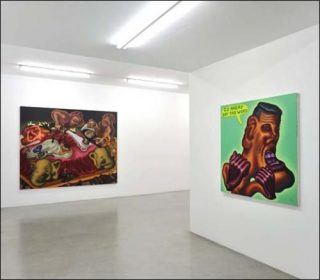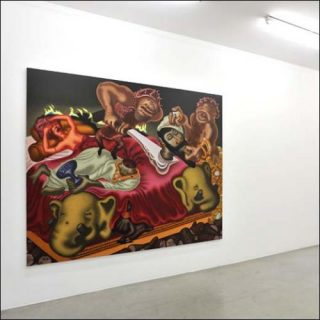 L’artiste porte un même regard décalé, plein d’un humour en demi-teinte sur le travail artistique. Dans la première salle, l’une des toiles reprend une scène historique. La tête décapitée d’un homme pend d’une hache. Au second plan, une femme, dans un lit, semble se tordre de douleur ou d’un plaisir masochiste. Pour cette scène de massacre, Peter Saul reprend les principes de constructions de la peinture classique: il réalise d’abord un dessin sur la toile, travaille le fond, puis les éléments secondaires de la composition et enfin s’attache à la figure noble de l’œuvre, tout en forçant volontairement sur l’outrance, le mauvais goût des couleurs.