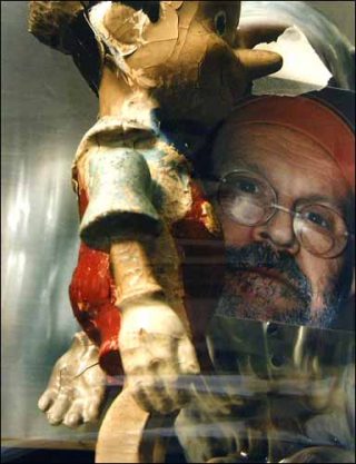 Dans The Boy Who is Craking, une figurine de Pinocchio occupe le centre de l’image. Le cadrage très resserré la fait déborder du cadre et focalise notre regard sur la surface usée du jouet dont les couleurs vives se sont craquelées avec le temps. Dans une autre photographie intitulée Edge of the Dream, le visage poupin de Pinocchio nous regarde fixement, et son expression lisse et figée contraste avec celle du visage souriant de Dine qui apparaît à l’arrière plan. Cette figurine qui se retrouve dans trois compositions différentes renvoie aux souvenirs d’enfance, et son usure au vieillissement de l’artiste.