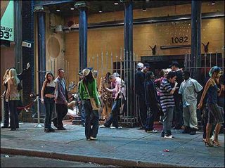 C’est au numéro 1082 d’une avenue nord-américaine. Des jeunes filles et jeunes gens se répandent par grappes sur le trottoir, jonché de mégots et autres détritus. Ils s’échappent ainsi d’une boîte de nuit bondée, pour prendre l’air. C’est l’été. Mais l’éclairage urbain est froid: un effet de nuit américaine qu’amplifie le rétro éclairage du caisson lumineux. La scène est ainsi projetée en avant, dans toute sa banalité.