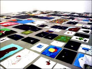 Les deux cents aquarelles peintes sur différents formats se juxtaposent au sol et ne laissent que très peu de place à la déambulation. La pérégrination est délicate et l’installation semble précaire. Un moment d’inattention pourrait déranger cet assemblage fragile. Cependant l’équilibre instable est l’un des principaux aspects du travail de l’artiste.