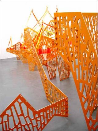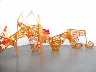 La présente exposition questionne moins la peinture que l’objet d’art. Une impressionnante structure, ou plutôt une sculpture-luminaire en bois, s’étale sur presque la totalité de la galerie.