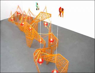 L’exposition « De la peinture » s’inscrivait dans une nouvelle peinture, une peinture métisse; aujourd’hui, et encore avec Jorge Pardo, apparaît une nouvelle sculpture, un nouvel objet d’art à la limite de l’art et de l’objet manufacturé (ici la lampe ici, mais ailleurs d’autres objets — sièges, tables, etc.). Un mouvement qui s’exprime dans la Galerie Hussenot également avec les œuvres de Franz West.
