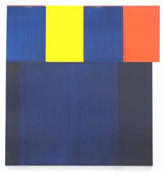 En d’autres endroits, Knoebel insiste au contraire sur l’adhésion de la couleur au support en peignant vigoureusement la surface de manière à laisser visibles les traces du pinceau puis en fermant cet ample mouvement du haut vers le bas par des coups de pinceaux horizontaux soulignant avec insistance les bords du support.