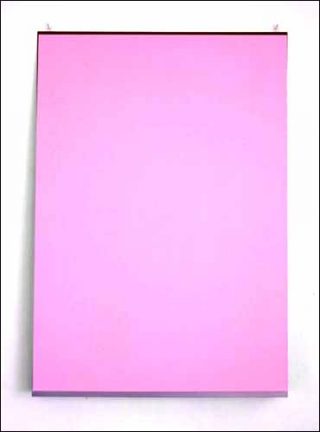 Uniquement fixé au mur par le bord supérieur, ce décollement progressif de la surface du haut vers le bas évoque un store que l’on aurait tiré. Ainsi soustrait au regard, le fond déborde cependant sur les côtés de la surface couvrante, en une présence persistante qui retient le regard, déplace l’attention de la surface vers les bords du tableau.