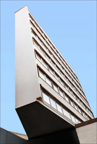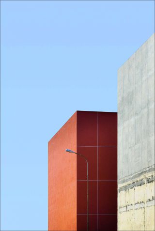 Il y a, bien sûr, des airs de peinture abstraite, dans les scènes réelles capturées par Niccolò Montesi. Là , le jaune tendre d’un préau tranche dans un joyeux contraste avec le bleu immaculé du ciel. Plus loin, un lampadaire et un cube orange suggèrent à eux seuls tout un univers immobile, splendidement géométrique. Ici, c’est un bâtiment posé en équilibre, comme la proue d’un navire, entre deux morceaux de ciel.
