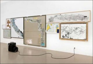 A ce propos, Meterriss (2011), Å“uvre centrale au sens propre comme au figuré, apparaît sans conteste comme le clou du spectacle. Une grosse chaîne métallique d’une longueur totale d’environ soixante-quinze mètres, reliée à distance régulière par des tendeurs, vient enserrer sept des douze salles de l’exposition à un mètre de hauteur. La tension qu’elle imprime sur les murs est telle que les maillons ont grignoté le plaquo, si profondément par endroit que les structures de bois et d’aluminium qui supportent les plaques ont été tordues, broyées par cette force destructrice.