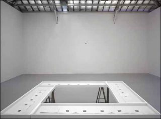 Indice d’une dématérialisation: deux panneaux de plexiglas en vis-à-vis, sur lesquels se détachent les traces bleues laissées par l’artiste, servent de transition, de passage vers l’autre «chapitre» de l’exposition. Le support bi-dimensionnel se fait plus discret, il semble vouloir disparaître. Deuxième salle, le vide… ou presque.