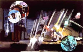 Les différents plans de vision obligent d’ailleurs à déambuler devant les toiles pour saisir les sujets, imaginer les hors-champs, regarder les détails isolés, puis l’ensemble, éprouver la profondeur suggérée par des incrustations d’images dans le tableau. La multiplication des points de vue produit des tensions entre les images associées. L’espace du tableau est animé par l’incohérence des plans entre eux et par un décalage entre la gestualité spontanée et un resserrement pictural vers le sujet.