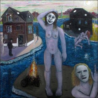 Eric Corne. La dimension sensuelle est importante dans ma peinture. C’est vrai que j’essaie de retenir l’intensité de l’amour physique qui est un point de l’indicible, de l’intime. il y a toujours dans mes toiles, un monde près de l’écroulement, à la dérive où des récits se croisent. Une tension de récits contradictoires entre la ruine, la violence, le danger, la séparation et cette énergie sexuelle où se mêle le désespoir et l’espoir. Le nu est toujours en effraction avec le paysage. Ce dernier l’abrite, mais ne fait pas corps avec lui.