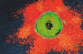 Ainsi dans Nid rouge, des branches d’érable dressent un toit fragile au-dessus d’une forme ovale creusée à même le sol, et recouverte d’un gazon au vert profond. Située au milieu de l’image et parsemée d’une gerbe de sorbes rouges carmin, l’entrée de ce berceau primitif — qui semble attendre un corps ou un œuf — baigne dans une flaque de lumière douce, filtrée par le feuillage des arbres alentour. Sur un registre plus épuré encore, mais filant toujours la métaphore originelle, Red Rock Nest montre, adossé à une roche, un nid de bambou ceint par une constellation d’oranges et de citrons jaunes et verts disséminés sur une terre sombre.