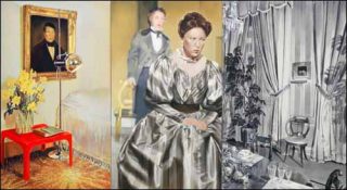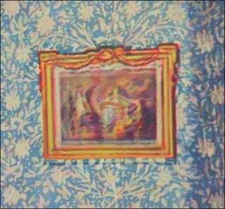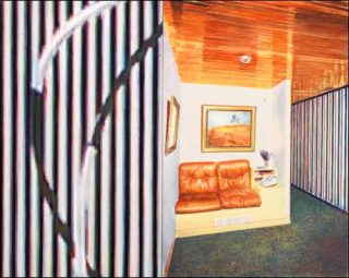 A droite, une autre toile, peinte uniquement en valeurs de gris, représente un intérieur Biedermeier, typique du milieu du XIXe siècle, et dont la datation pourrait concorder avec celle des costumes de la première toile. A gauche enfin, un autre intérieur, plutôt datable des années 1970, fait le lien entre les deux époques grâce à un portrait d’homme, que l’on peut lui aussi, situer au XIXe siècle.