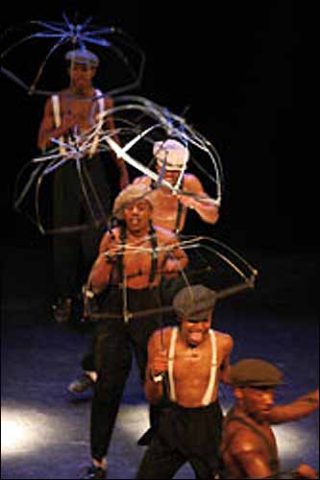 Tout au long de la pièce, il y va de prouesses techniques, de virtuosité, de confrontation et de défi, de dérision et de détournement des codes. La danse est rythmée par les frappes de mains et de pieds ; tout un arsenal de chaussures sera à tour de rôles utilisé : des converses, des gumboots, des semelles en métal, des claquettes se succèdent dans des frappes à la force toujours incroyable. Il y a par moments de brèves séquences narratives pour évoquer une confrontation entre groupes ou styles différents, une manifestation qui finit en rixe avec les autorités et fait des victimes, ou encore une séance de transe à travers laquelle le groupe tente de ramener à la vie l’un de ses membres. La musique peut être grandiloquente et pathétique, ou carrément de la musique de boite de nuit à l’atmosphère surchauffée et érotique. Mais il ne s’agit pas d’autre chose que de raconter l’histoire inscrite à même les corps et vécue au quotidien pendant l‘époque de l’apartheid.