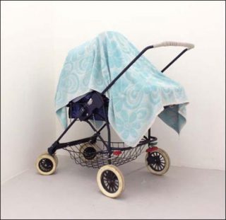 — Claire Fontaine, Contrebande, 2011. Poussette et serviette de toilette. 100 x 50 x 150 cm