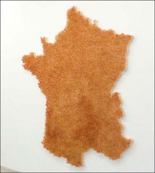 — Claire Fontaine, France (burnt/unburnt), 2011. Carte de France, allumettes fichées dans le mur. Dimensions variables