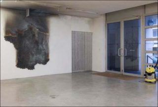 Il plane comme une odeur de brulé à l’entrée de la galerie Air de Paris. Rien d’étonnant lorsque le regard s’arrête sur une carte de France en grande partie carbonisée, et sur les traces de brûlé qui atteignent même le plafond! La carte est recouverte d’allumettes fichées au mur: les unes sont a moitié consumées, les autres encore intactes ont échappé à l’incendie. Cette gigantesque forêt de brindilles inflammables semble faire écho à la fragilité politique du pays, «n’importe qui pouvant y mettre le feu».