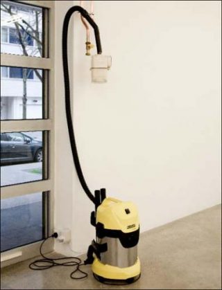 — Claire Fontaine, Recession Sculpture (GDF), 2011. Aspirateur Dyson, compteur de gaz français , détecteur de presence, tubes de cuivre et fixations