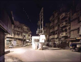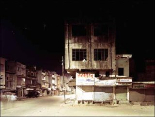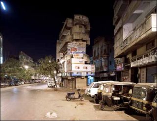 Mais la nuit, par un travail plus personnel, il met la ville à nu quand, entre minuit et cinq heures du matin, Ahmedabad est plus calme. Un décor insolite apparaît alors : un gigantesque chaos architectural fait de béton et de tôles greffés aux bâtiments du XVIIIe siècle, tenant à la fois du palais, du bunker et du bidonville. Un mélange tout aussi improbable qu’un enchevêtrement de fils électriques et de cerfs-volants…